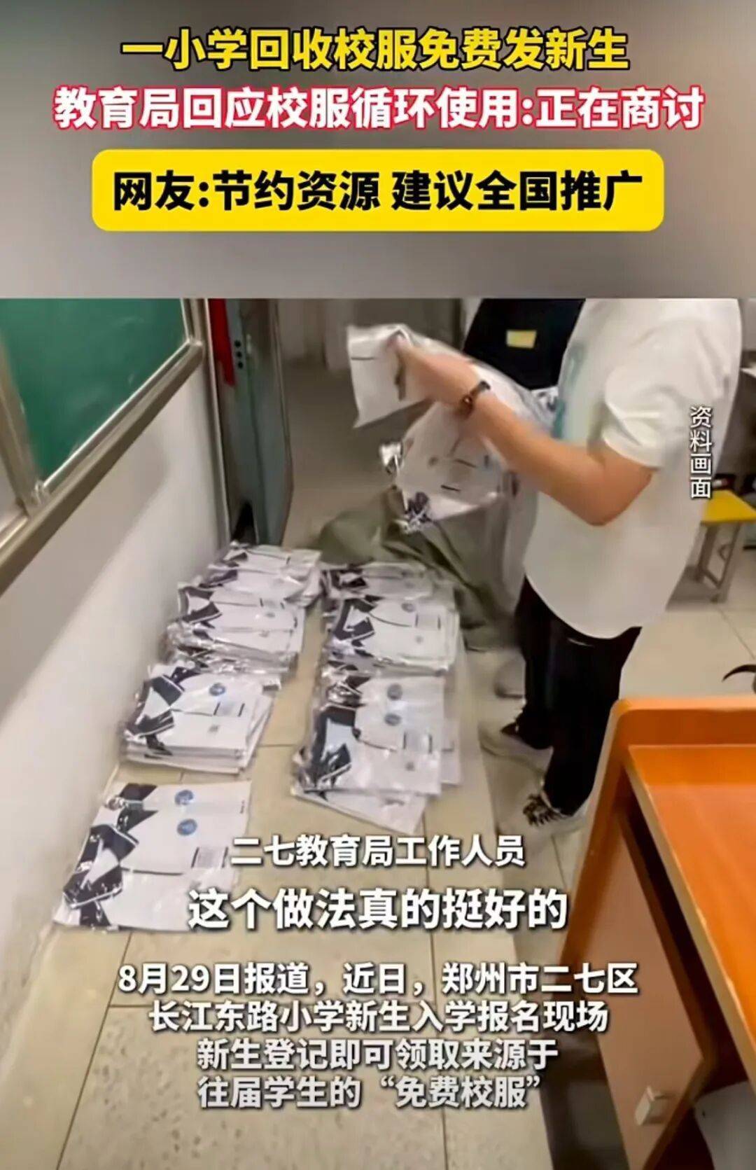 当然,供需两端都秉持了自愿原则,并非一刀切地向学生提出强制性要求。据报道,今年一年级新生报到首日,该小学150套循环校服便被领取97套。